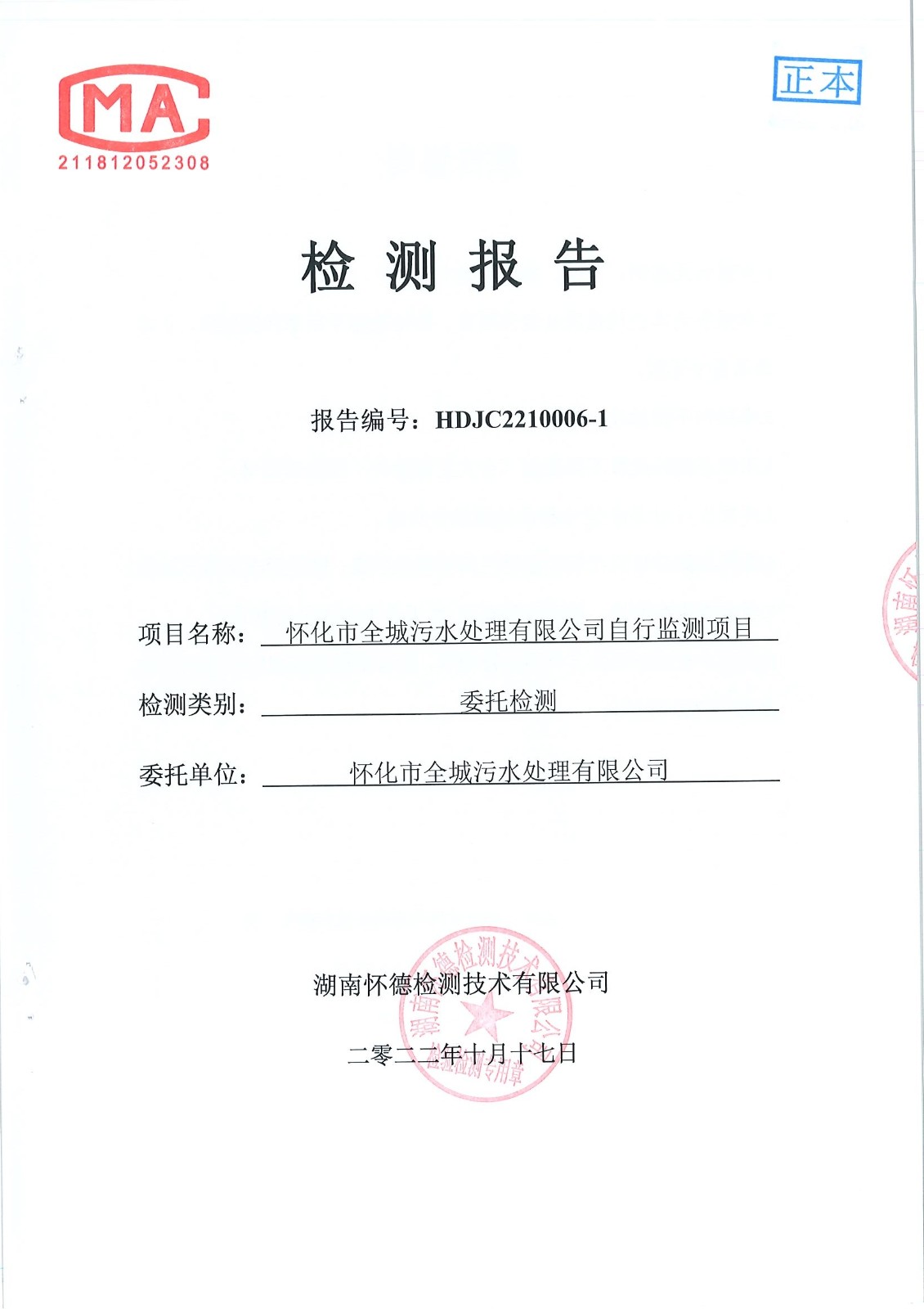 怀德检测 2022年10月 污水检测报告